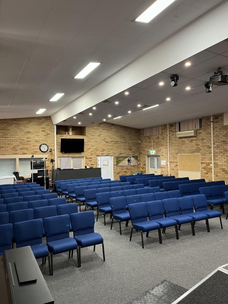 In 2024 we provided Wagga Church of Christ with 120 Church Chairs. The church, based in Tuvey Park, NSW, was looking for comfortable, versatile seating for their church hall. After looking at a few different options, the church chose our Church Chairs customised in Royal Blue Rhombus upholstery and Silvervein frames. They chairs add a pop of colour to the hall while remaining understated.